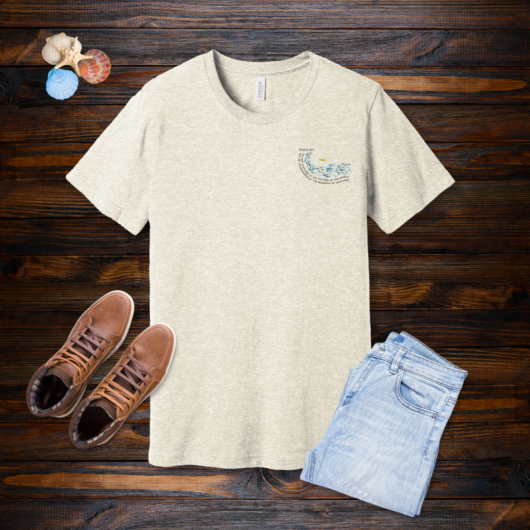 A unisex jersey short sleeve tee featuring a school of fish design on the back swimming in a spiral, with one lone mustard-colored fish swimming the opposite direction. The front includes Romans 12:2: “Do not conform to this world but be transformed by the renewing of your mind.”