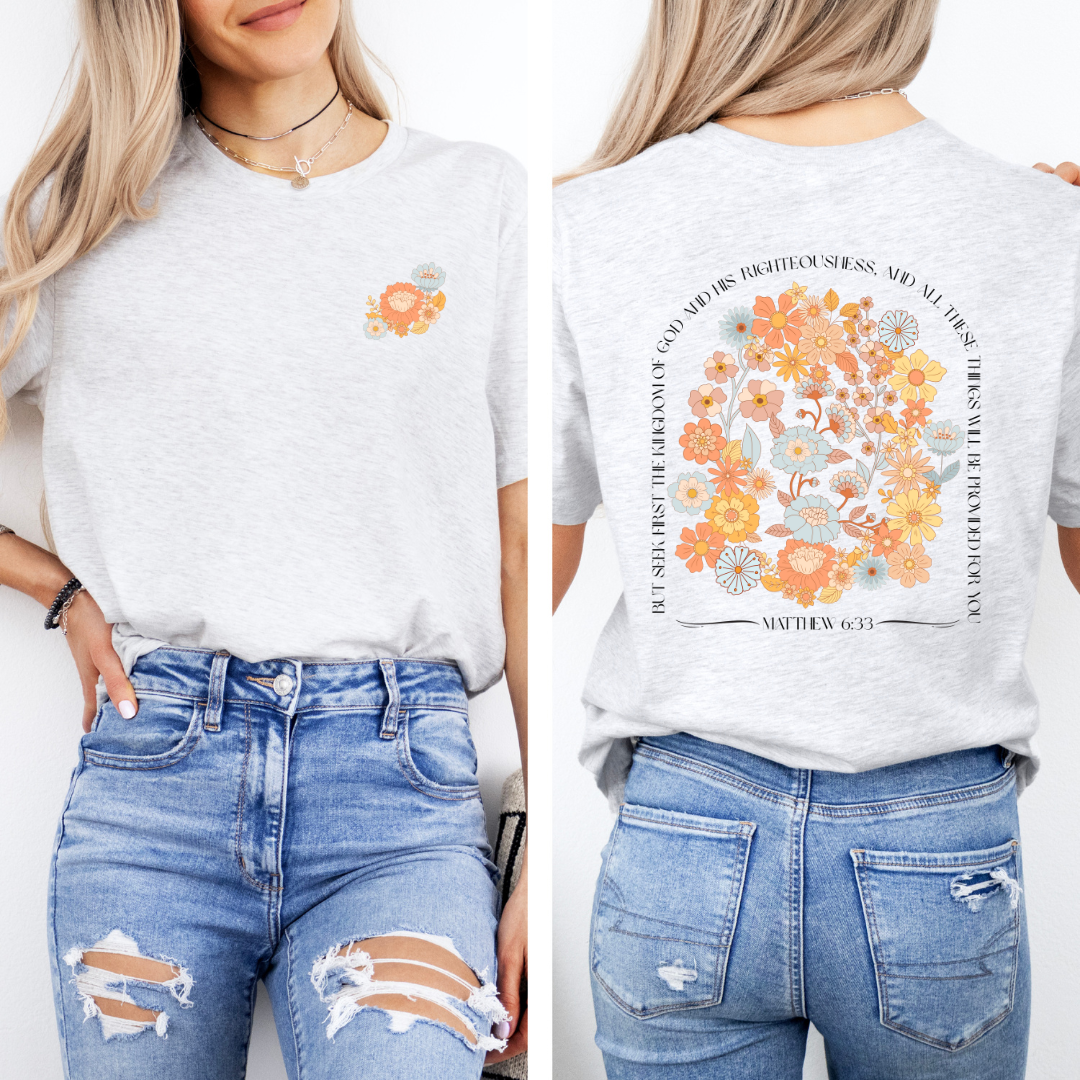 A beautiful reminder to keep God first, this shirt blends faith and art. Both the front and back feature peach, orange, and light blue flowers. On the back, the verse “But seek first the kingdom of God and his righteousness, and all these things will be provided for you.” Matthew 6:33 is framed in a cathedral-window shape for a soft, feminine touch.